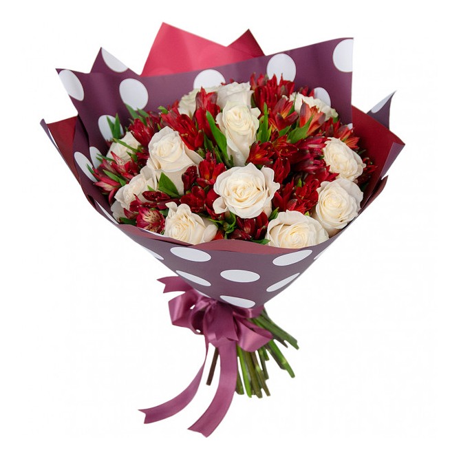 Контрастный букет сочетает нежные белые розы и яркие красные альстромерии. Идеальный подарок для выражения искренних чувств. Букет с доставкой на дом в Новокузнецке.